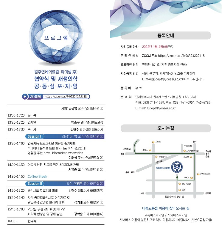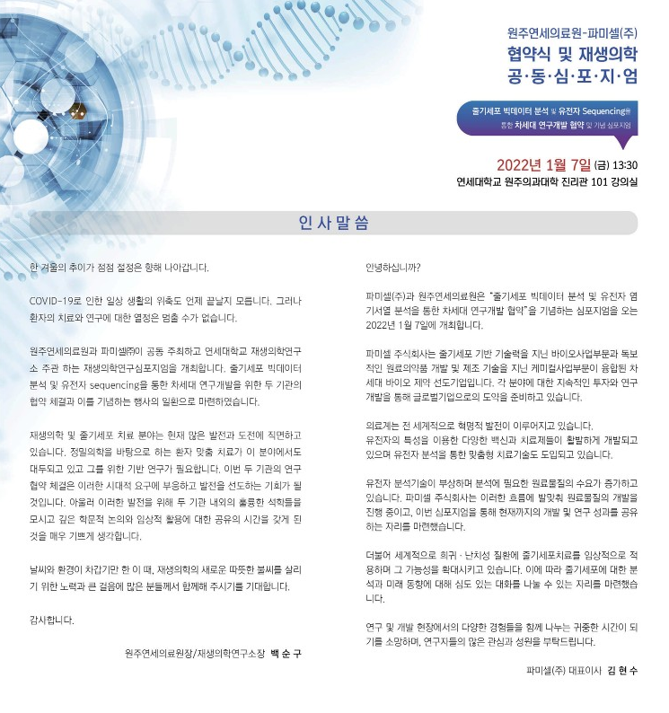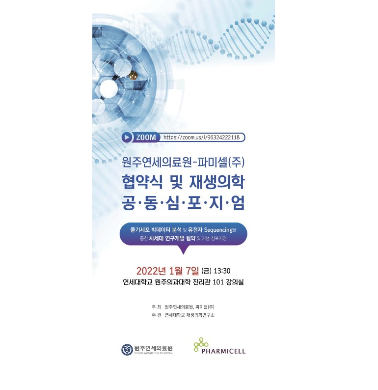 파미셀은 원주연세의료원과 함께 오는 2022년 1월 7일 오후 1시 30분에 공동 심포지엄을 개최합니다.