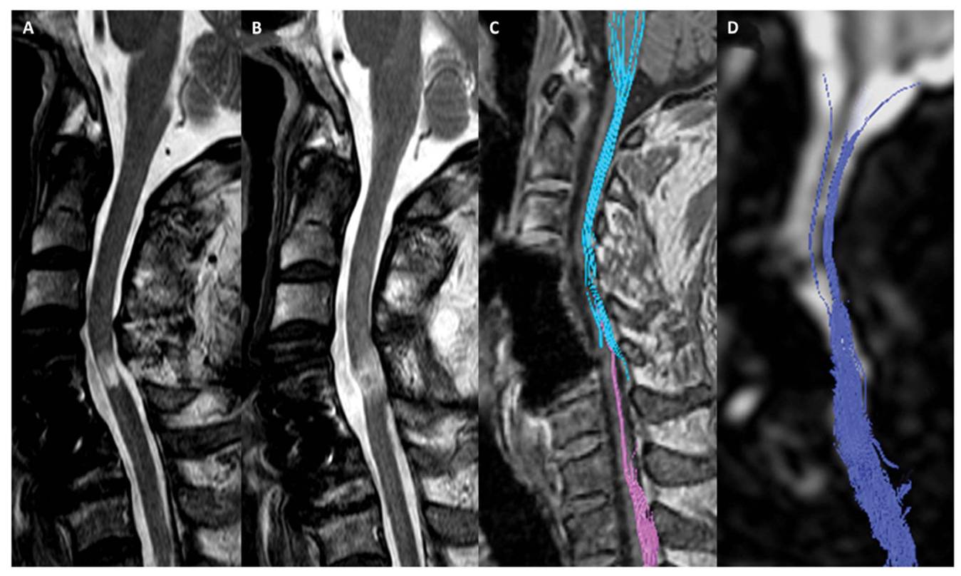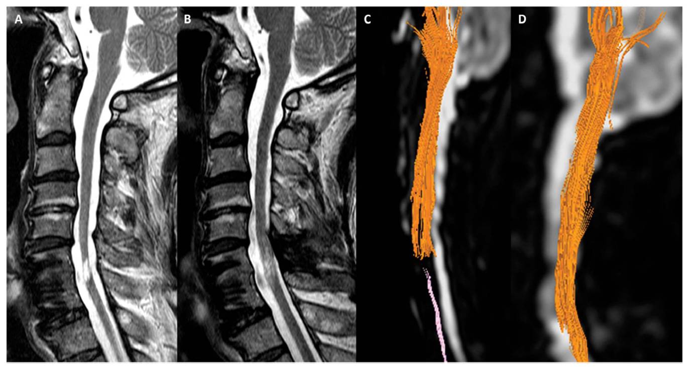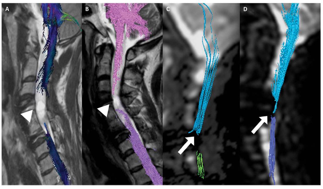 [환자의 MRI와 DTI검사결과다. 줄기세포치료제투여하기 전(A와C)에 비해 투여 후 6개월이 경과한 후(B와 D)에는끊어진 척수신경이 재생되었음을 확인할 수 있다.]